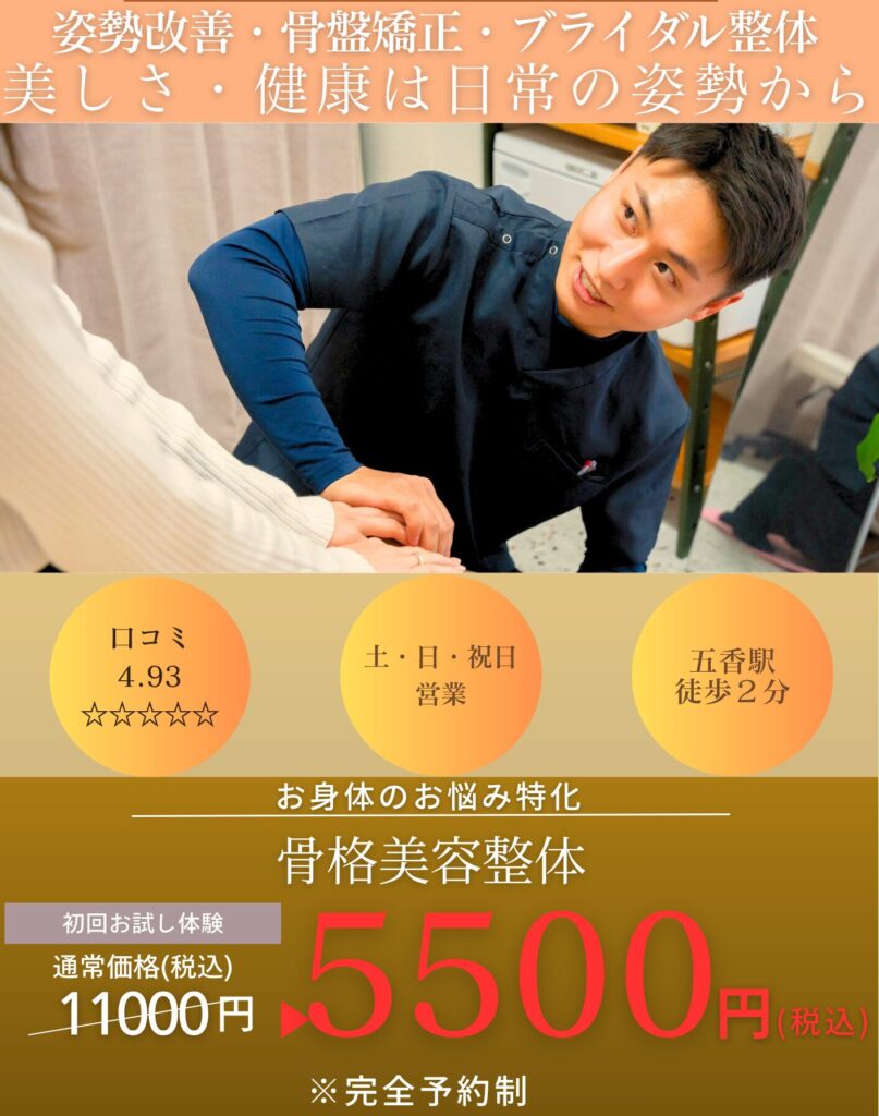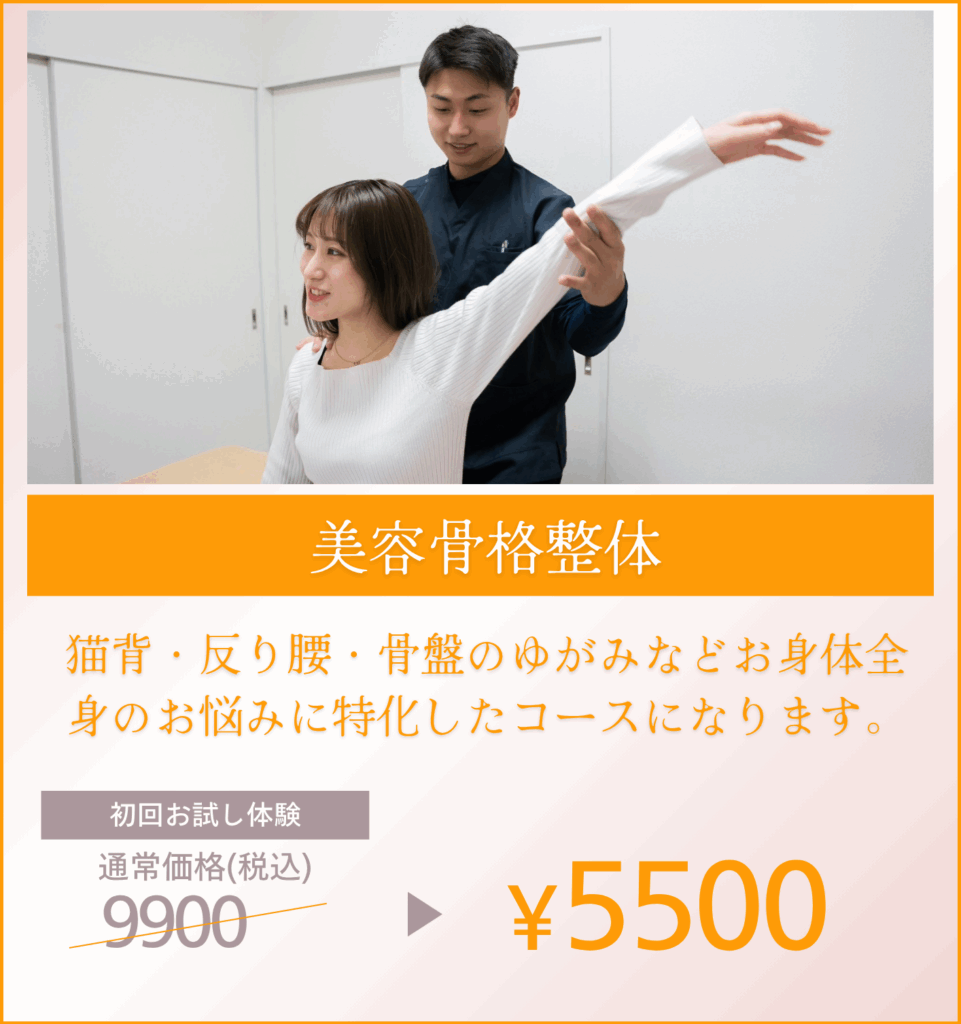 当サロンの整体は『ほぐすだけ』『ボキボキするだけ』ではありません。 筋肉・関節・姿勢のバランスを整え、日常の疲れを根本から改善します。 慢性的な肩こりや腰痛、姿勢の崩れ、むくみなどのお悩みの方におすすめです。